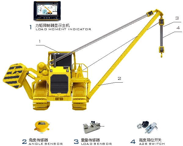 吊管機(jī)力矩限制器主要由力矩限制器顯示器、角度傳感器、重量傳感器、高度限位開關(guān)等組成。通過各傳感器檢測(cè)信號(hào),可以實(shí)時(shí)在顯示器上顯示起重機(jī)的額定起重量、實(shí)際起重量、角度、作業(yè)幅度等信息,并根據(jù)情況輸出報(bào)警信號(hào)和控制信號(hào),輔助作業(yè)人員安全操作起重機(jī)。