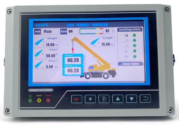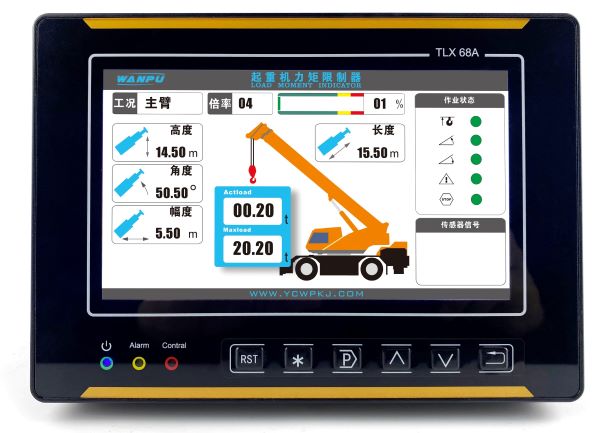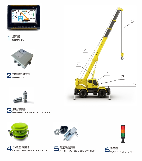 越野起重機力矩限制器主要由力矩限制器顯示主機、液壓傳感器、長/角度傳感器組成。通過各傳感器檢測信號,可以實時在顯示器上顯示起重機的額定起重量、實際起重量、臂長、角度等信息,并根據(jù)情況輸出報警信號和控制信號,輔助作業(yè)人員安全操作起重機。