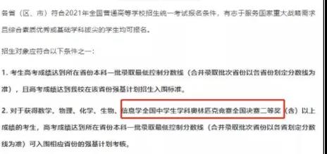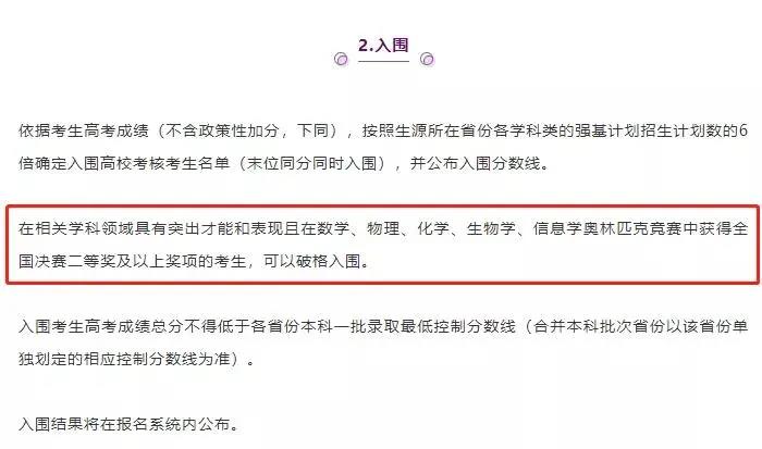 今年試點的36所高校發(fā)布的“強基計劃”招生簡章中,也明確標明:如果信奧賽決賽二等獎及其以上的學生,可以不受分數(shù)影響破格入圍。