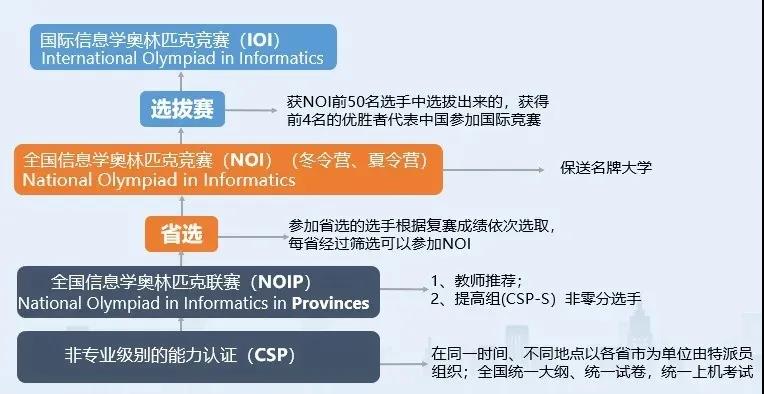 信息學奧賽級別分為省級聯(lián)賽(NOIP),國家決賽(NOI)與國際競賽(IOI)。