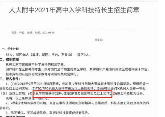 今年5月份,人大附中發(fā)布《2021年高中入學科技特長生招生簡章》,值得注意的是:CSP-J三等獎就能作為科技特長生報名。
