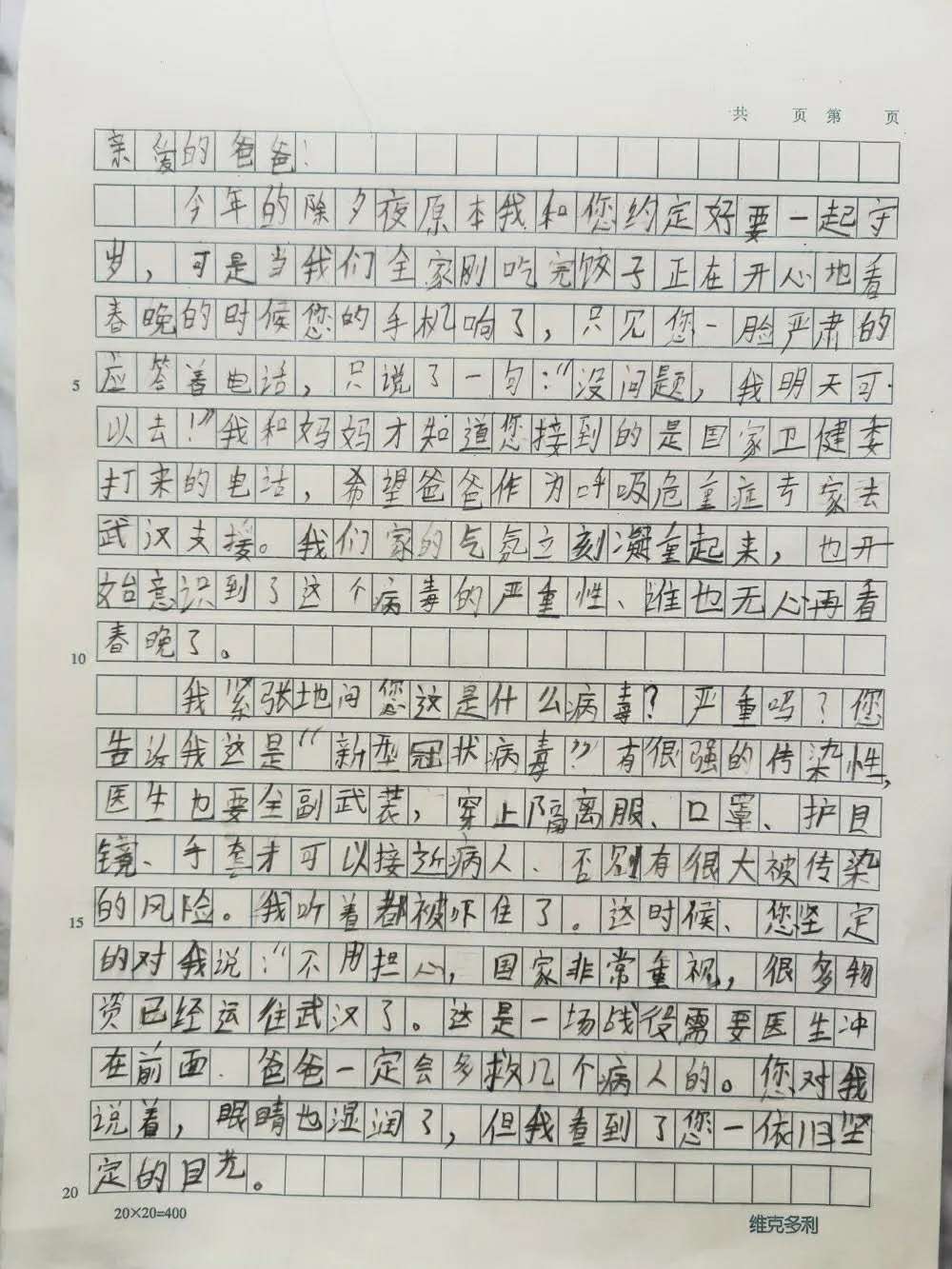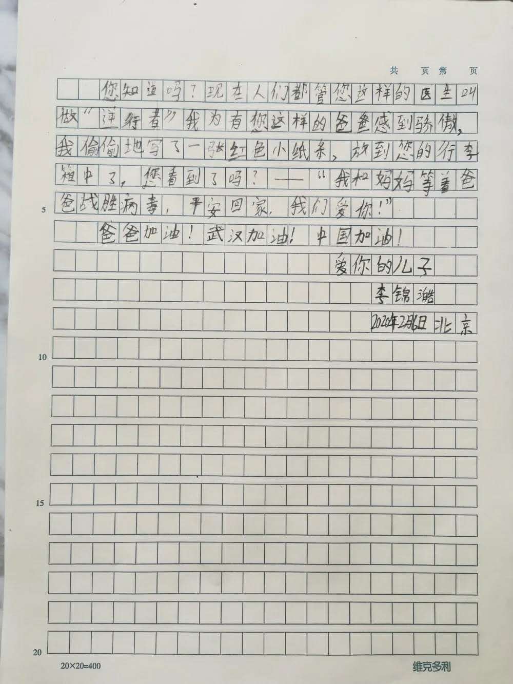 待在家的日子里,在學(xué)習(xí)學(xué)校安排的網(wǎng)課之余,媽媽時常會錄下錦澔開心地學(xué)習(xí)編程的小視頻發(fā)給爸爸,讓爸爸在結(jié)束一天的救治病患工作之后能感受到來自家的溫馨和快樂,一家人就用這種特殊的方式彼此陪伴。期間,特別想念爸爸的時候,錦澔還給爸爸寫了一封家書,訴說思念,并表達(dá)了對爸爸的崇敬之情。
