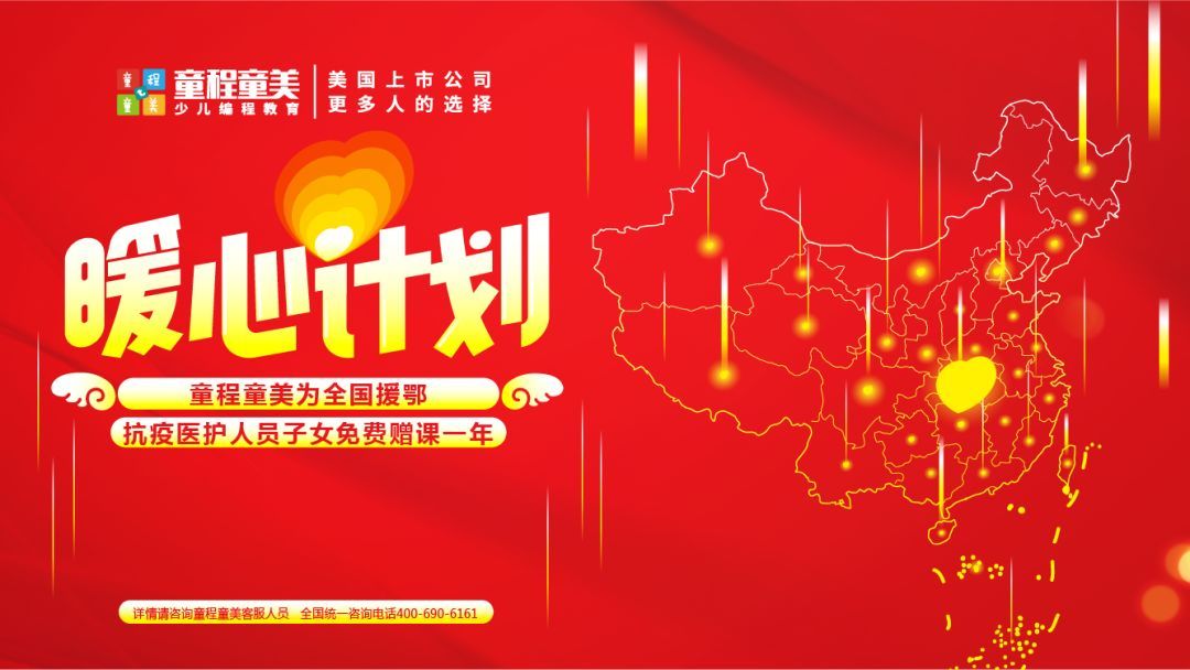 童程童美“暖心計劃”在行動,后續(xù)我們將陸續(xù)為您講述,援鄂英雄與童程童美的故事。做教育,我們不僅要傳道授業(yè)解惑,更要有溫度、有責(zé)任、有擔(dān)當(dāng),未來童程童美將繼續(xù)堅守做一個有溫度的品牌,在少兒編程教育領(lǐng)域,為中國少年開辟一片更美好的未來!