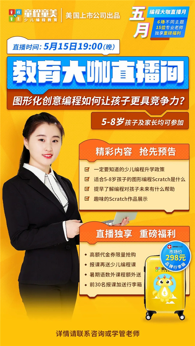 為了幫助更多的孩子和家長(zhǎng)深入了解圖形編程Scratch是什么,5月15日晚19:00,童程童美人工智能課程教研大咖驚喜降臨 “童程童美教育大咖直播間”,全面解讀圖形化創(chuàng)意編程如何讓孩子更具競(jìng)爭(zhēng)力?