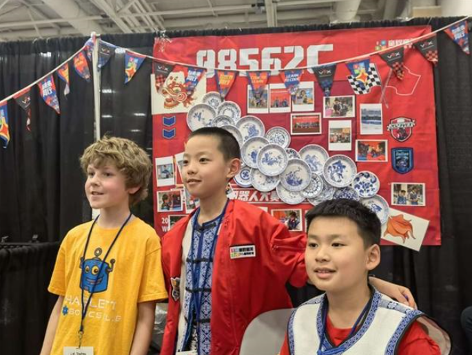 2023年4月,在美國達拉斯舉辦的第十五屆VEX世錦賽現(xiàn)場,幾位中國少年形成了一道靚麗的風景線。青花瓷拼成的龍元素在中國紅的背景上一躍而出,向世界展示著中國文化的絢麗多彩。據(jù)悉,他們是來自中國知名少兒編程與機器人教育機構(gòu)童程童美的參賽選手。
