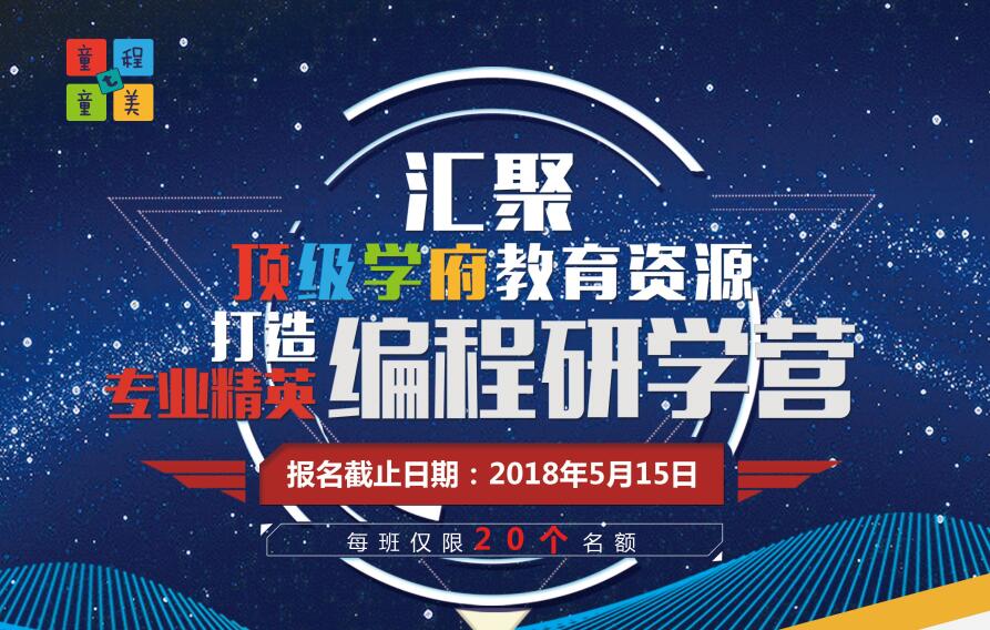 童程童美編程研學(xué)營開始啦!匯集頂尖學(xué)府教育資源,打造專業(yè)精英編程研學(xué)營!報名截止日期為2018年5月15日。每班僅限20個名額哦!?