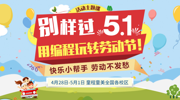 童程童美推出五一主題活動課——用編程玩轉(zhuǎn)勞動節(jié)!闖關(guān)贏童幣,趣味學(xué)編程,幸運(yùn)大抽獎,好禮送不停!活動時間:2018年4月28日-5月1日,童程童美全國校區(qū)火爆開啟!