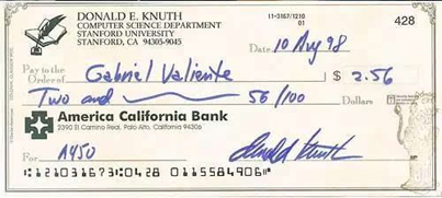 此外,他還為TEX系統(tǒng)設(shè)立了獎金,第一個發(fā)現(xiàn)系統(tǒng)漏洞的人,可以獲得2.56美金;  第二個人可以獲得5.12美金。依此類推,我們都知道,傳說某個國王就因為這種指數(shù)游戲,失去了江山,也有人嘲笑微軟,說比爾蓋茨再有錢,如果每有一個bug就賠錢,他早就傾家蕩產(chǎn)了。高德納作為算法大師,更清楚指數(shù)增長的可怕性。然而到現(xiàn)在為止,他只寄出過兩張支票,可見他對完美的追求有多么極致。