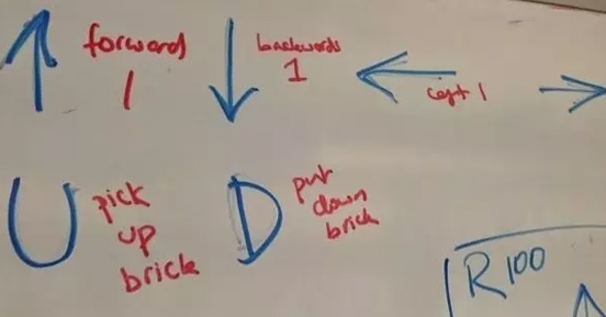 在課堂里學生分為幾個小組,編寫程序讓“機器人”用某種方式來堆樂高。每個小組都有一位學生扮演機器人的角色。機器人走到教室后面,按照程序員們所寫的程序來搭建樂高模型?!拔覀儚暮唵蔚拿铋_始,包括使用6個箭頭,其中4個代表方向,1個代表拿起積木,1個代表把積木放下來?!?