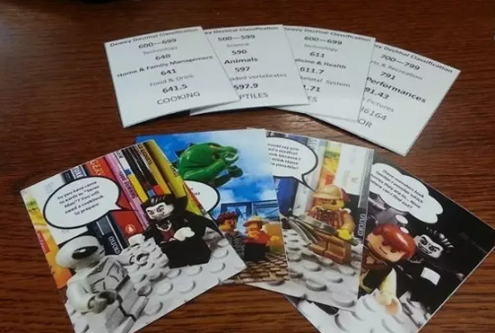 Farringtons學校的圖書管理員使用樂高卡片制作了一種卡片游戲,專門為7歲以上的孩子學習杜威十進制分類法(廣泛用于英語國家的圖書館)。每張卡片都畫上了不同的樂高人物,另一組配套的卡片則是杜威十進制分類的書籍卡片,通過配對游戲幫助孩子識別和理解書籍信息分類,訓練記憶力。