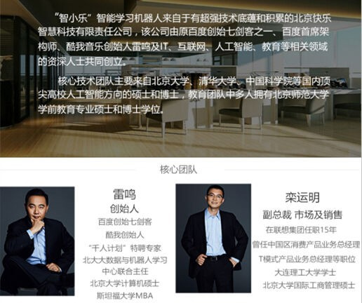 月28日,一款名為“智小樂”的兒童智能機(jī)器人在京東上發(fā)起了眾籌,這是一個(gè)成立于2015年的公司,去年9月開始了智能教育機(jī)器人項(xiàng)目,今年4月進(jìn)入產(chǎn)品內(nèi)測階段——這一切看起來都只是一個(gè)初創(chuàng)公司的正常信息。但引人注意的是,在這個(gè)產(chǎn)品眾籌的網(wǎng)站介紹上,其核心團(tuán)隊(duì)介紹當(dāng)中,創(chuàng)始人一欄,赫然是百度創(chuàng)始七劍客之一的雷鳴。